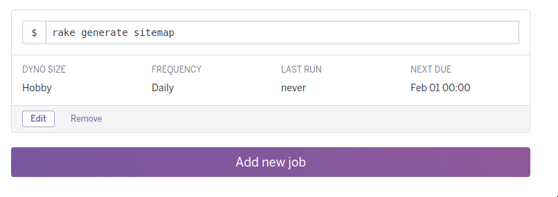 Now all that's left to do it to run the rake sitemap:refresh as an automatic task on heroku. For this I've used the free heroku scheduler addon (https://elements.heroku.com/addons/scheduler). This allows you to run a particular rake task (like sitemap:refresh) on a daily basis.